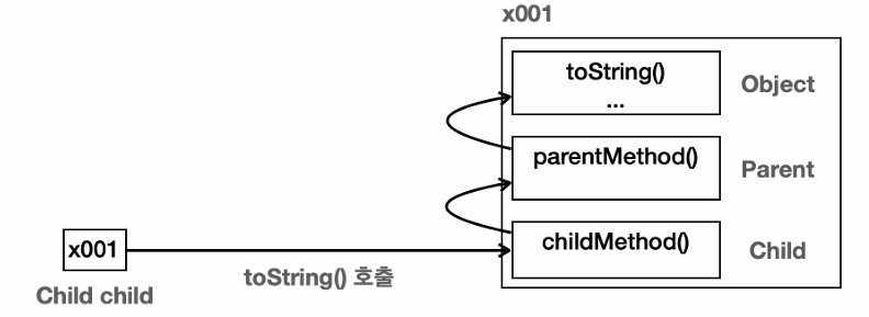 child.toString()을 호출하게 되면 부모타입 Parent가 상속받고 있는 Object 클래스를 호출하게 된다.