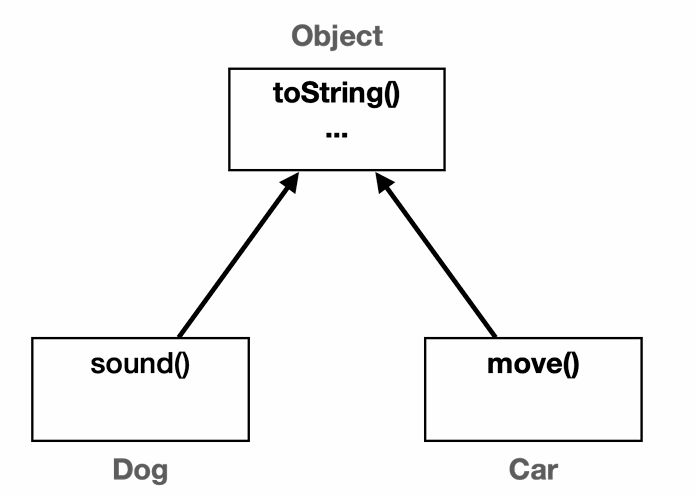 아래와 같이 Dog, Car 클래스가 있다. 둘은 서로 아무 관련이 없지만 자동으로 Object class 를 상속받는다.
