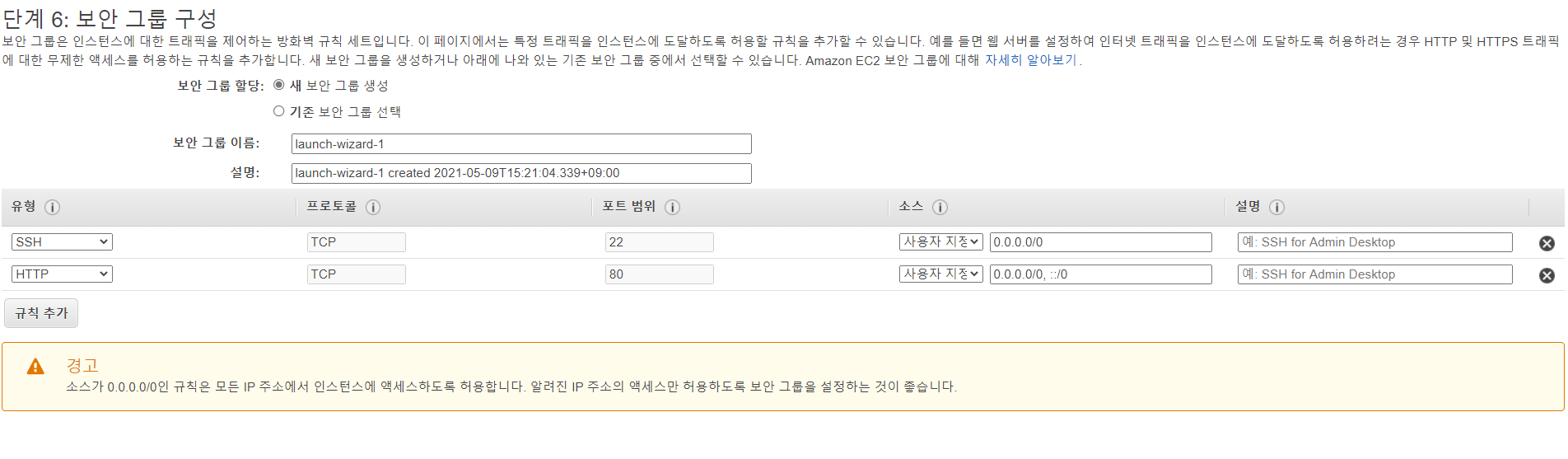 외부에서 접근하는 통신에 대한 보안 설정인데, 보안그룹의 이름을 지정하고 우리가 세팅한 것들을 저장할 수 있습니다.