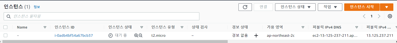 인스턴스를 클릭해서 우측 상단의 인스턴스 시작을 눌러줍니다.