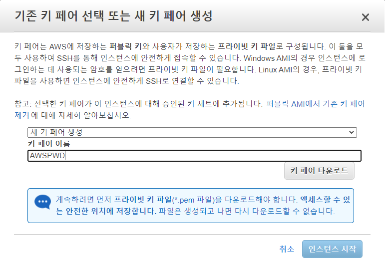 처음에는 새 키 페어 생성 을 통해 새로운 암호를 만들어서 키 페어 다운로드를 통해 다운로드 해야합니다.